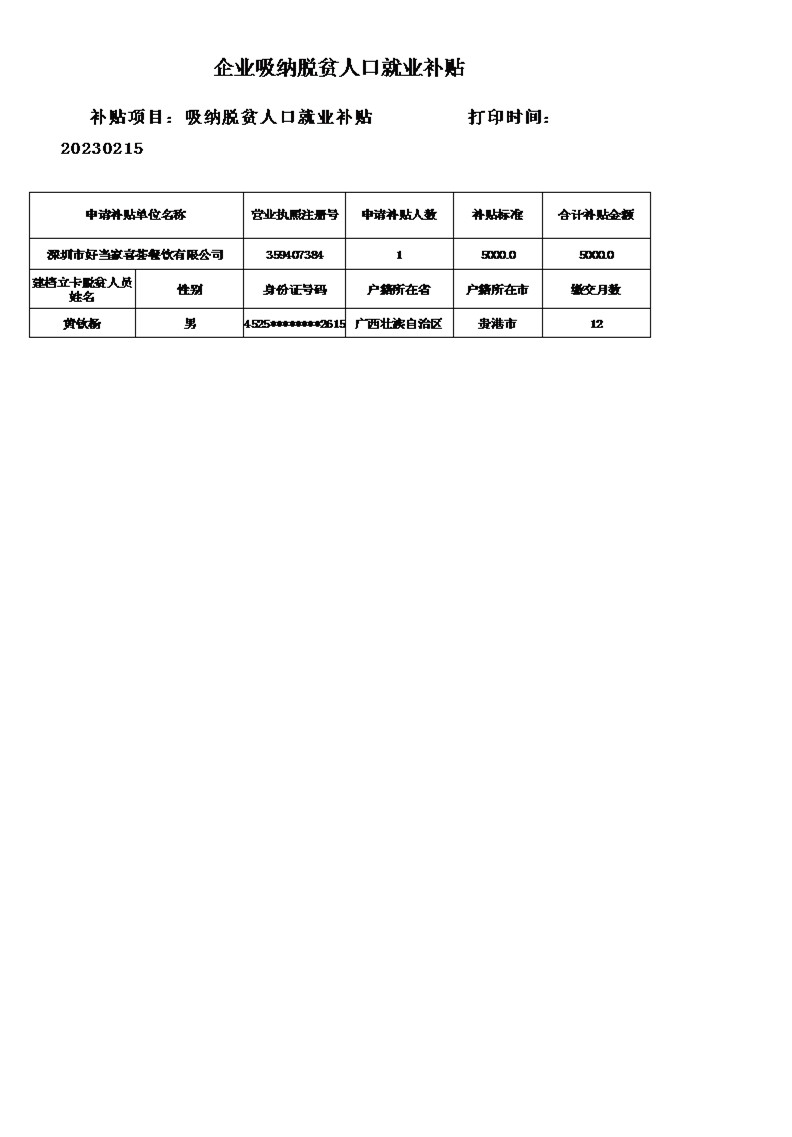 经审核,我单位拟发放深圳市好当家喜荟餐饮有限公司1家单位吸纳脱贫人口就业补贴,现将申请信息予以公示(名单见附件)。