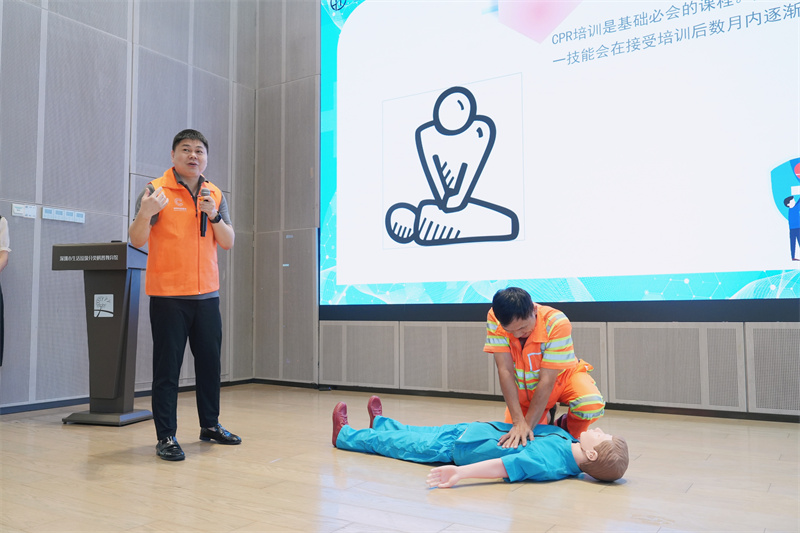 活动上禾思医美集团医疗部主任王抗先生还为大家进行一场健康讲座和心肺复苏急救培训,现场演示心脏复苏流程,并邀请环卫工人上台操作练习,通过生动的语言、形象的图例和现场模拟演示,以理论知识讲授与救护技能操作相结合的方式为环卫绿化工人的安全加码。
