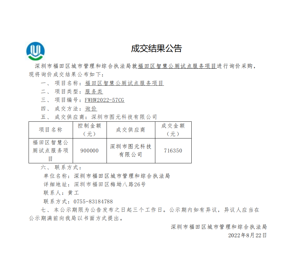 快三平台 城市管理和综合执法局关于快三平台 智慧公厕试点服务项目成交结果公告
