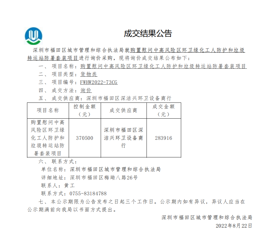 快三平台 城市管理和综合执法局关于购置慰问中高风险区环卫绿化工人防护和垃圾转运站防暑套装项目成交结果公告