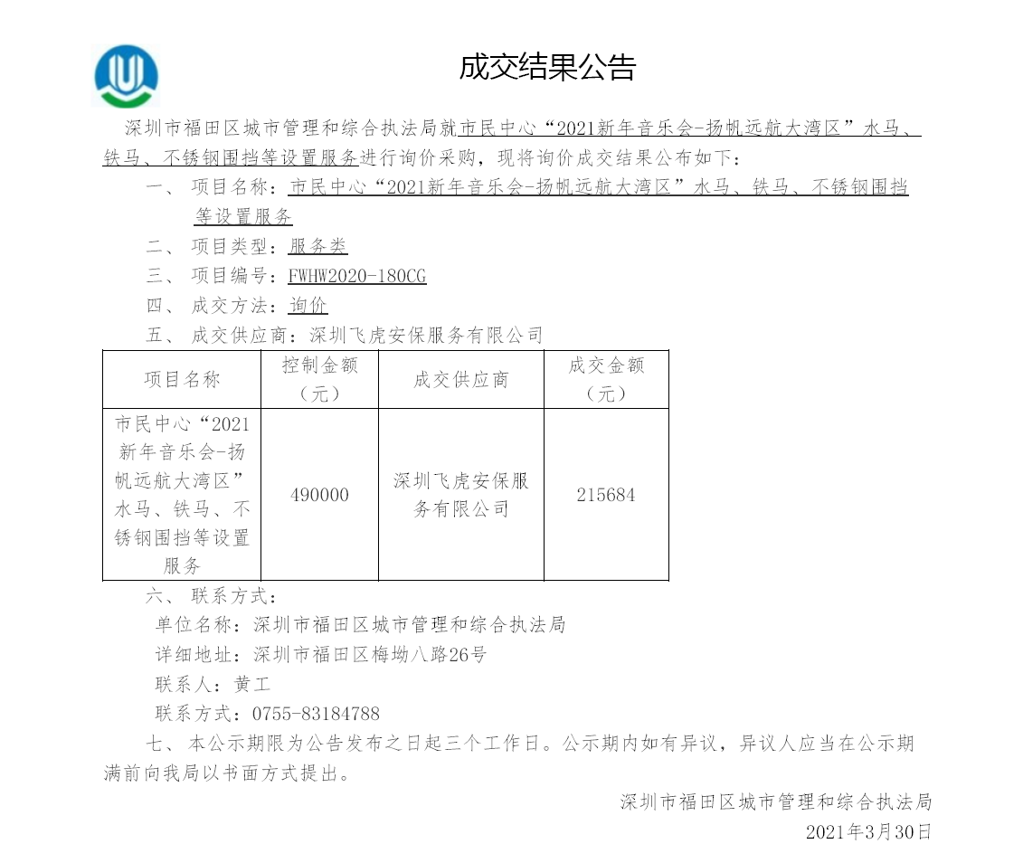 市民中心“2021新年音乐会-扬帆远航大湾区”水马、铁马、不锈钢围挡等设置服务成交结果公告