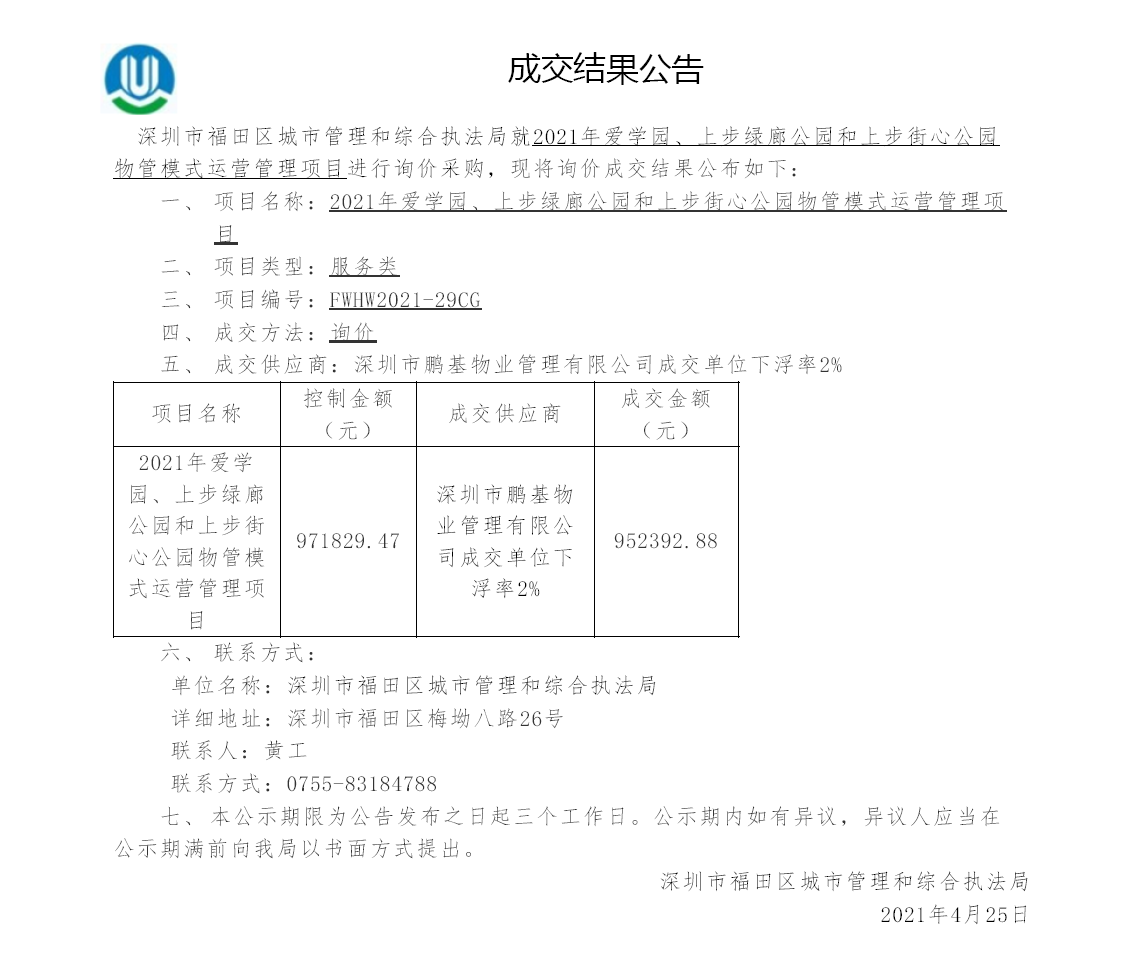 2021年爱学园、上步绿廊公园和上步街心公园物管模式运营管理项目成交结果公告