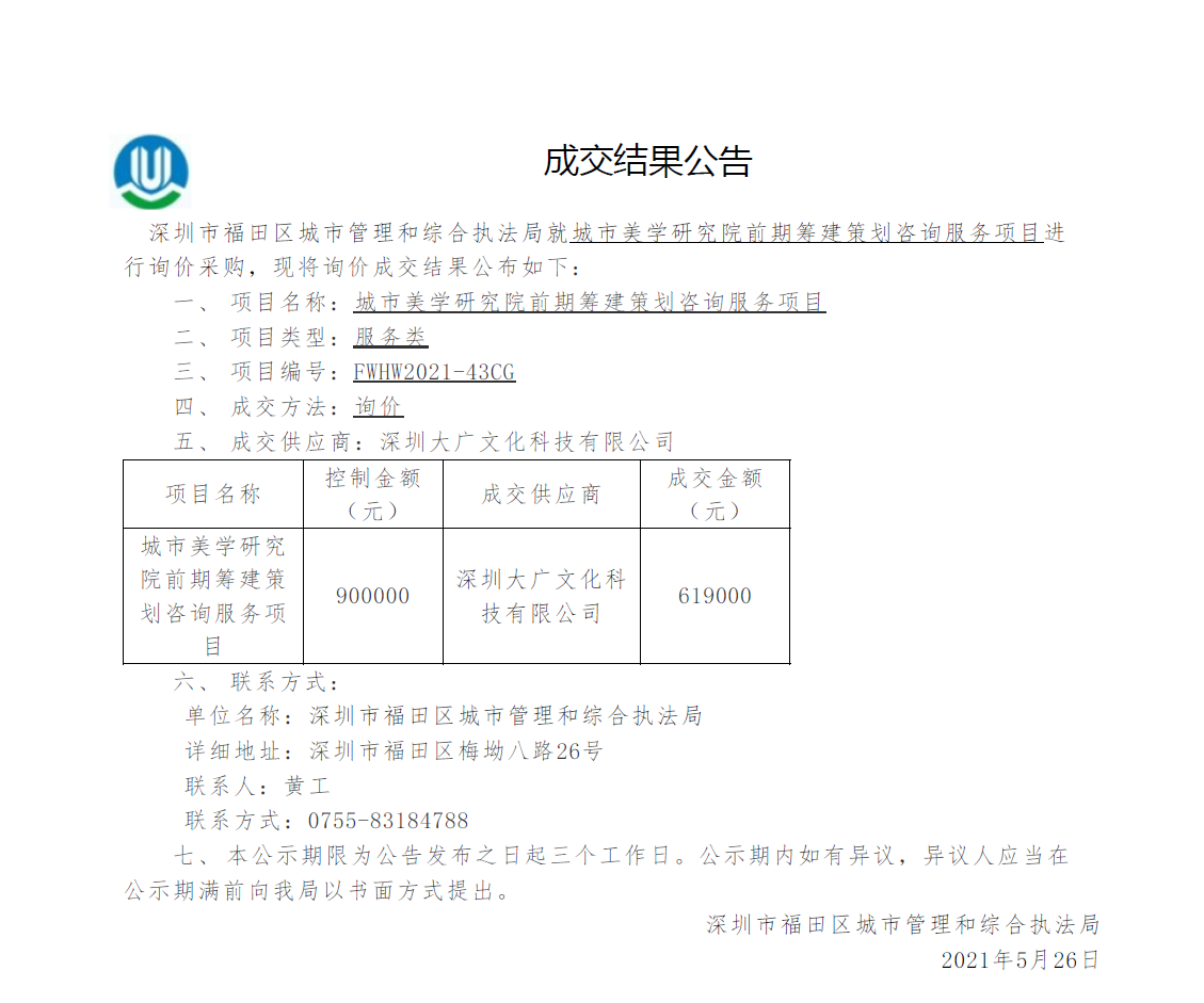 快三平台 城市管理和综合执法局关于城市美学研究院前期筹建策划咨询服务项目成交结果公告