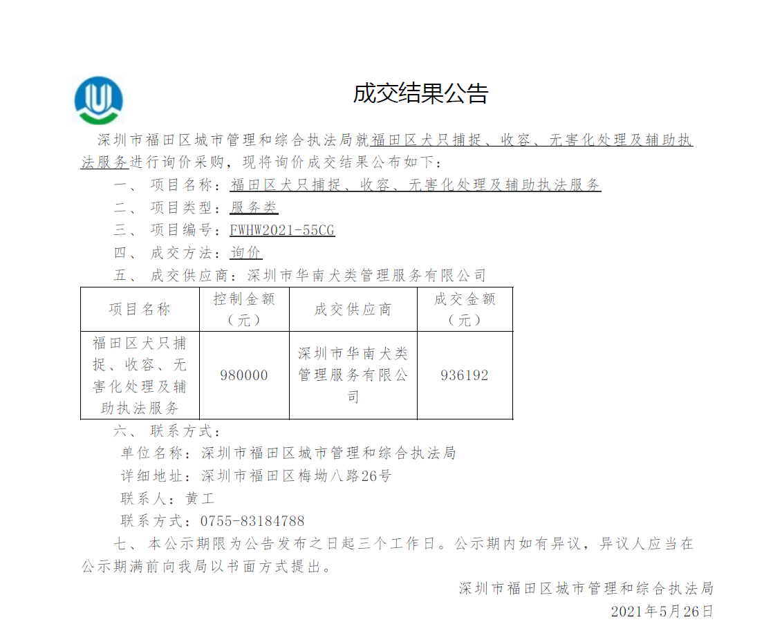 快三平台 城市管理和综合执法局关于快三平台 犬只捕捉、收容、无害化处理及辅助执法服务成交结果公告