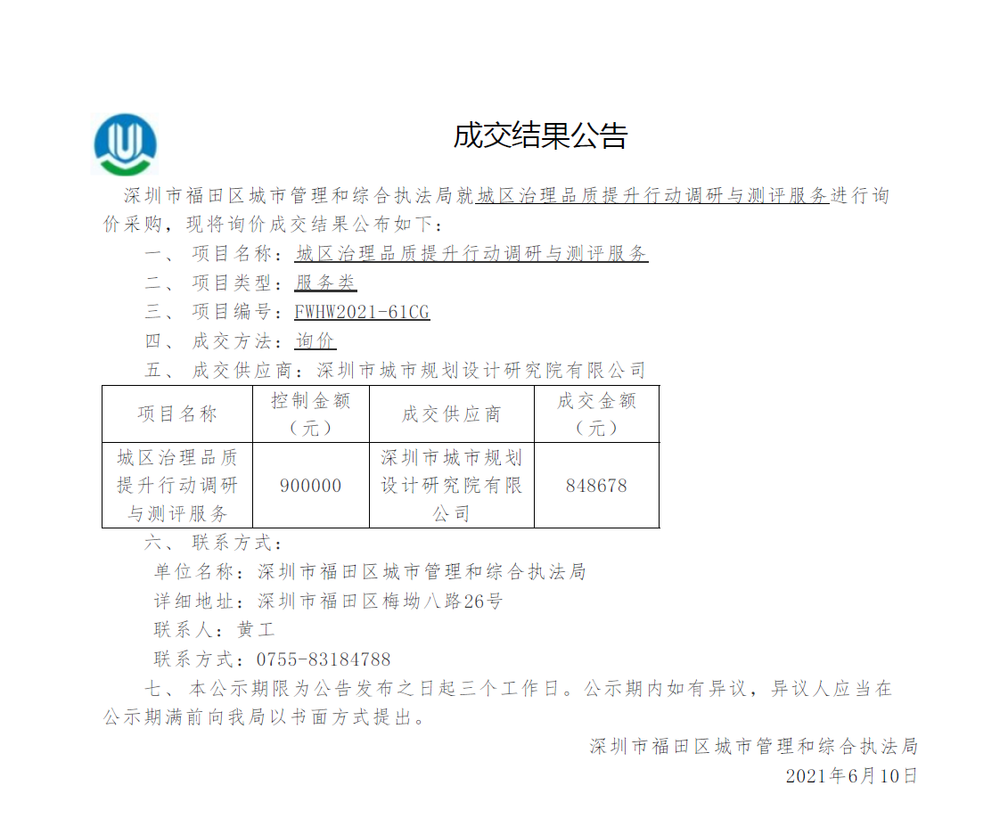 快三平台 城市管理和综合执法局关于城区治理品质提升行动调研与测评服务成交结果公告