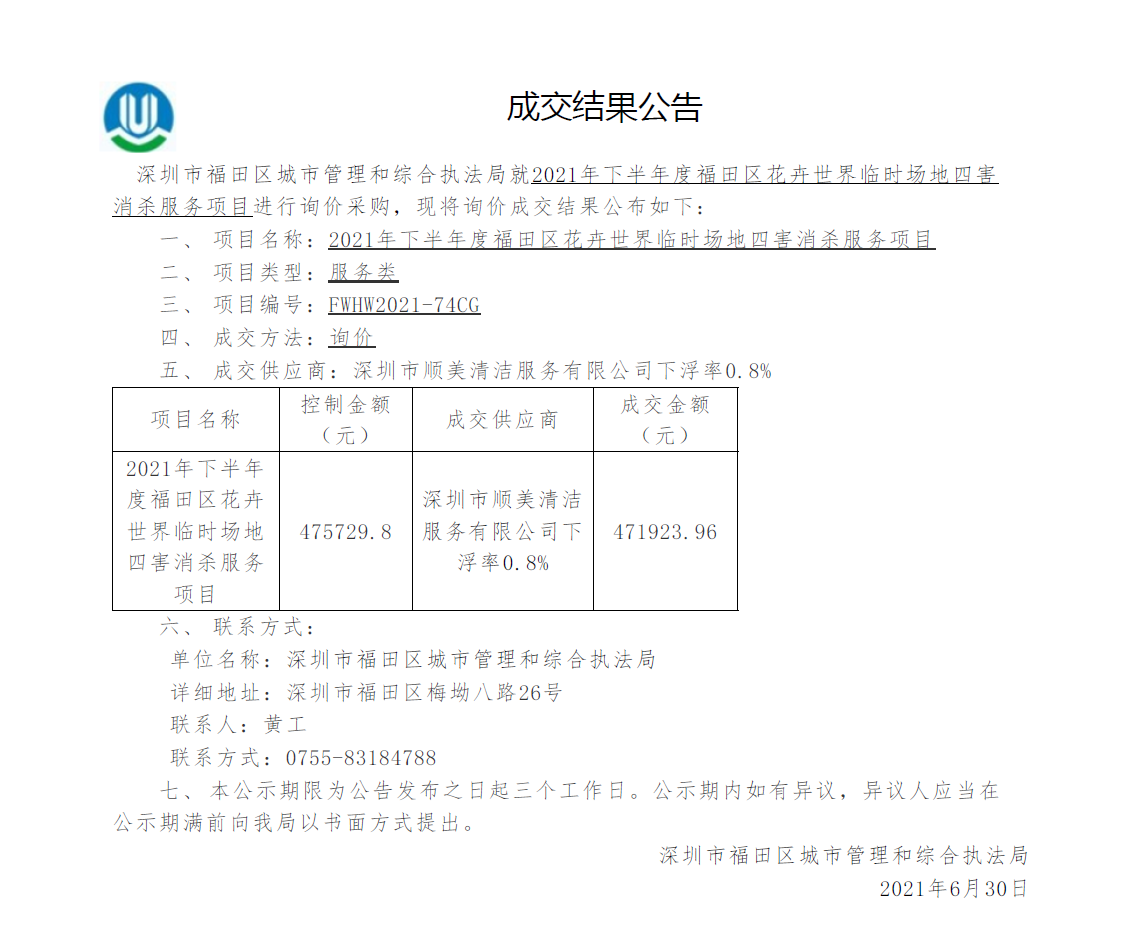 快三平台 城市管理和综合执法局关于2021年下半年度快三平台 花卉世界临时场地四害消杀服务项目成交结果公告