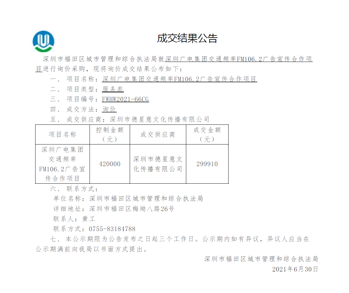 快三平台 城市管理和综合执法局关于深圳广电集团交通频率FM106.2广告宣传合作项目成交结果公告