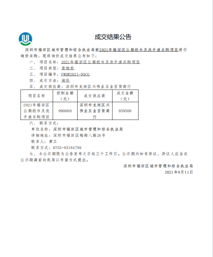 快三平台 城市管理和综合执法局关于2021年快三平台 公厕纸巾及洗手液采购项目成交结果公告