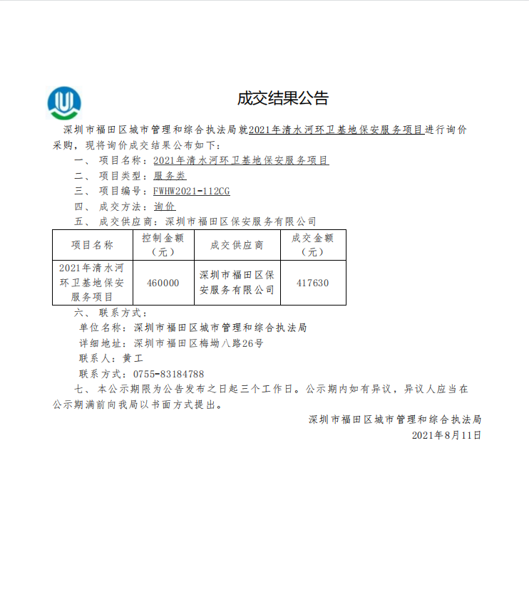 快三平台 城市管理和综合执法局关于2021年清水河环卫基地保安服务项目成交结果公告