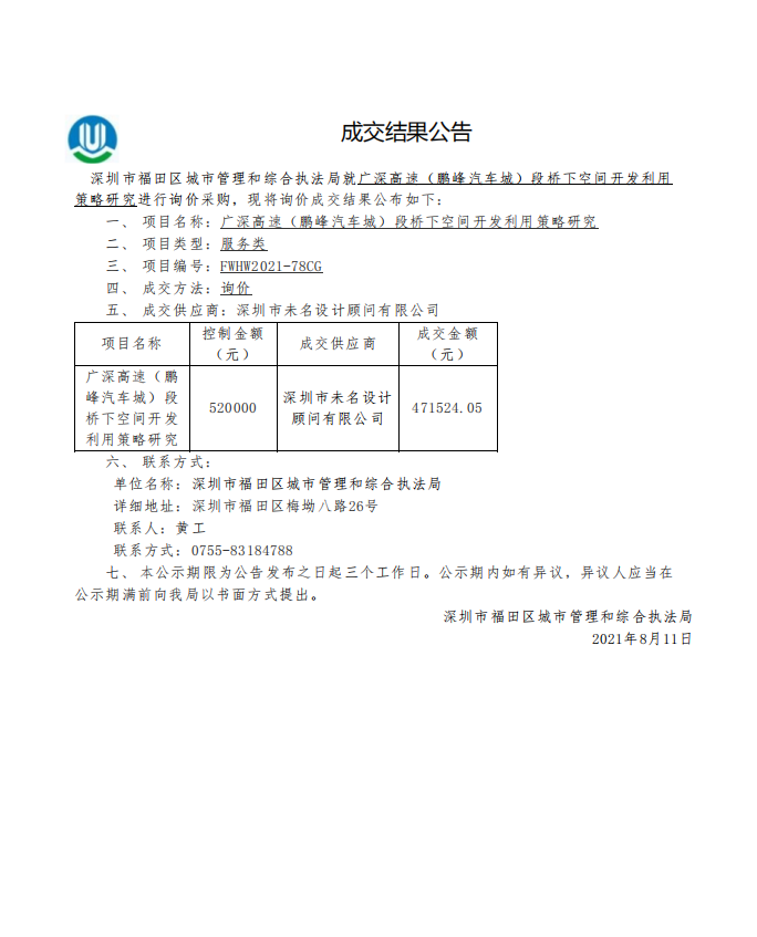 快三平台 城市管理和综合执法局关于广深高速(鹏峰汽车城)段桥下空间开发利用策略研究成交结果公告