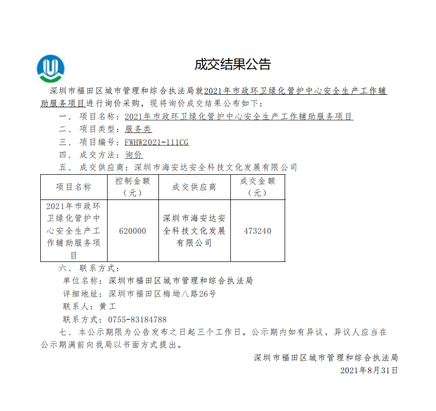快三平台 城市管理和综合执法局关于2021年市政环卫绿化管护中心安全生产工作辅助服务项目成交结果公告