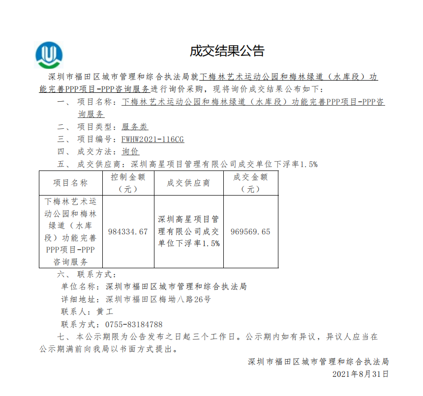 快三平台 城市管理和综合执法局关于下梅林艺术运动公园和梅林绿道(水库段)功能完善PPP项目-PPP咨询服务成交结果公告