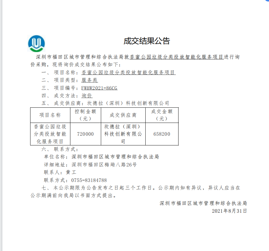 快三平台 城市管理和综合执法局关于香蜜公园垃圾分类投放智能化服务项目成交结果公告
