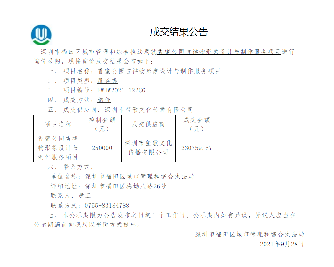 快三平台 城市管理和综合执法局关于香蜜公园吉祥物形象设计与制作服务项目成交结果公告