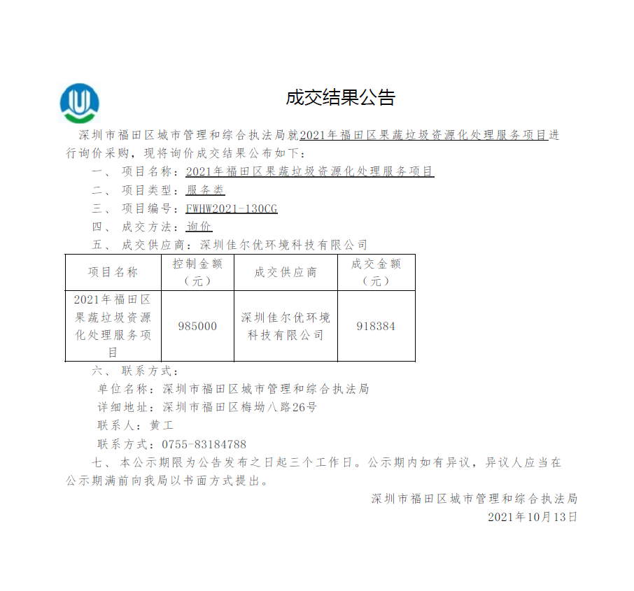 快三平台 城市管理和综合执法局关于2021年快三平台 果蔬垃圾资源化处理服务项目成交结果公告