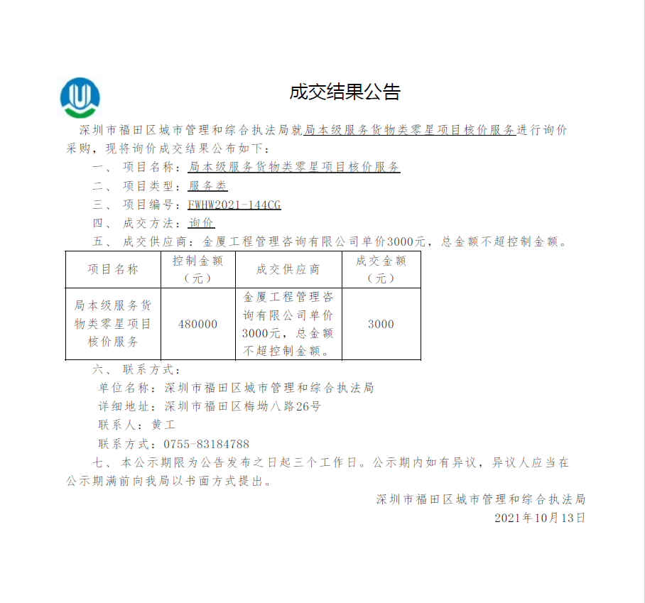 快三平台 城市管理和综合执法局关于局本级服务货物类零星项目核价服务成交结果公告
