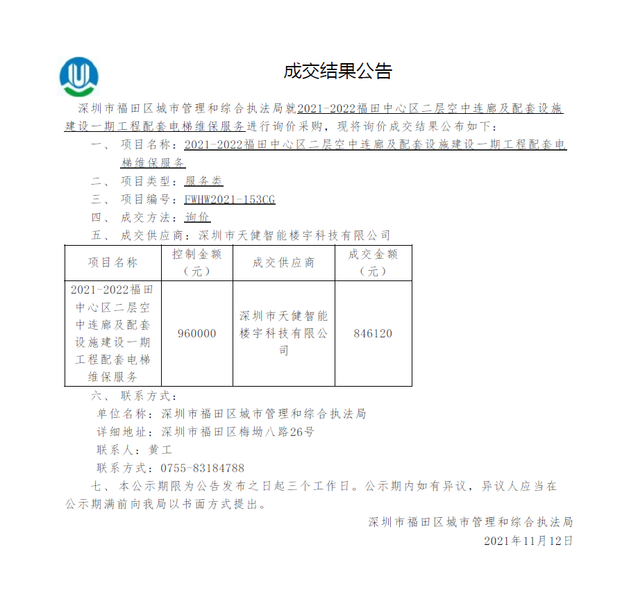 快三平台 城市管理和综合执法局关于2021-2022福田中心区二层空中连廊及配套设施建设一期工程配套电梯维保服务成交结果公告