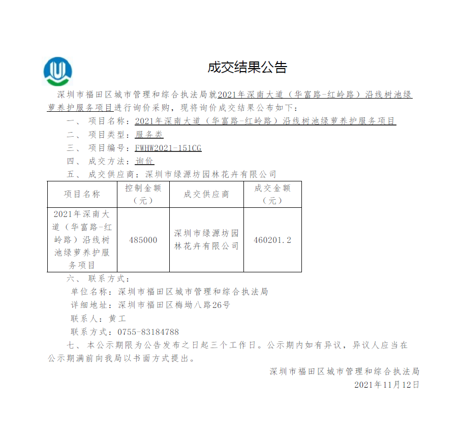 快三平台 城市管理和综合执法局关于2021年深南大道(华富路-红岭路)沿线树池绿萝养护服务项目成交结果公告
