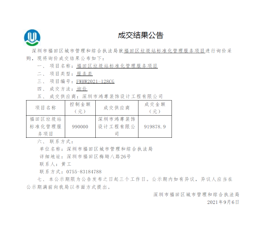 快三平台 城市管理和综合执法局关于快三平台 垃圾站标准化管理服务项目成交结果公告