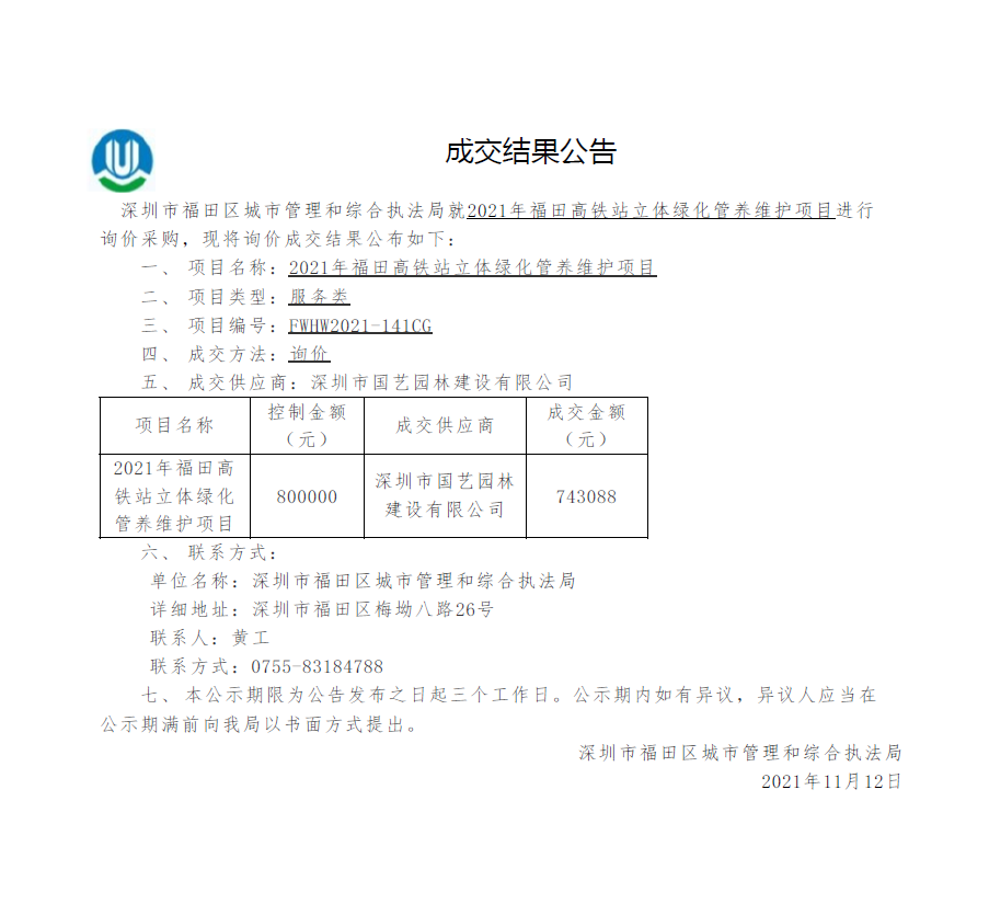 快三平台 城市管理和综合执法局关于2021年福田高铁站立体绿化管养维护项目成交结果公告