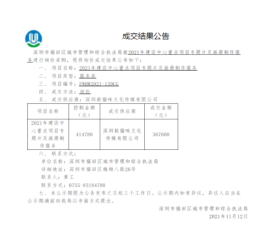 快三平台 城市管理和综合执法局关于2021年建设中心重点项目专题片及画册制作服务成交结果公告