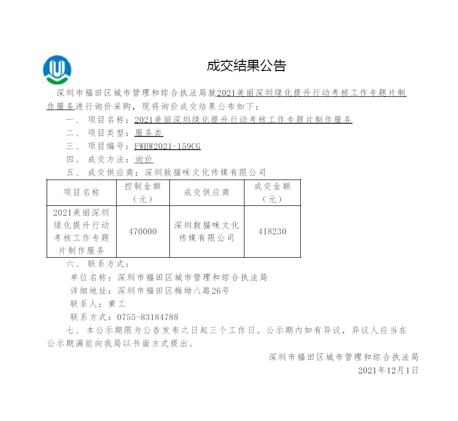 快三平台 城市管理和综合执法局关于2021美丽深圳绿化提升行动考核工作专题片制作服务成交结果公告