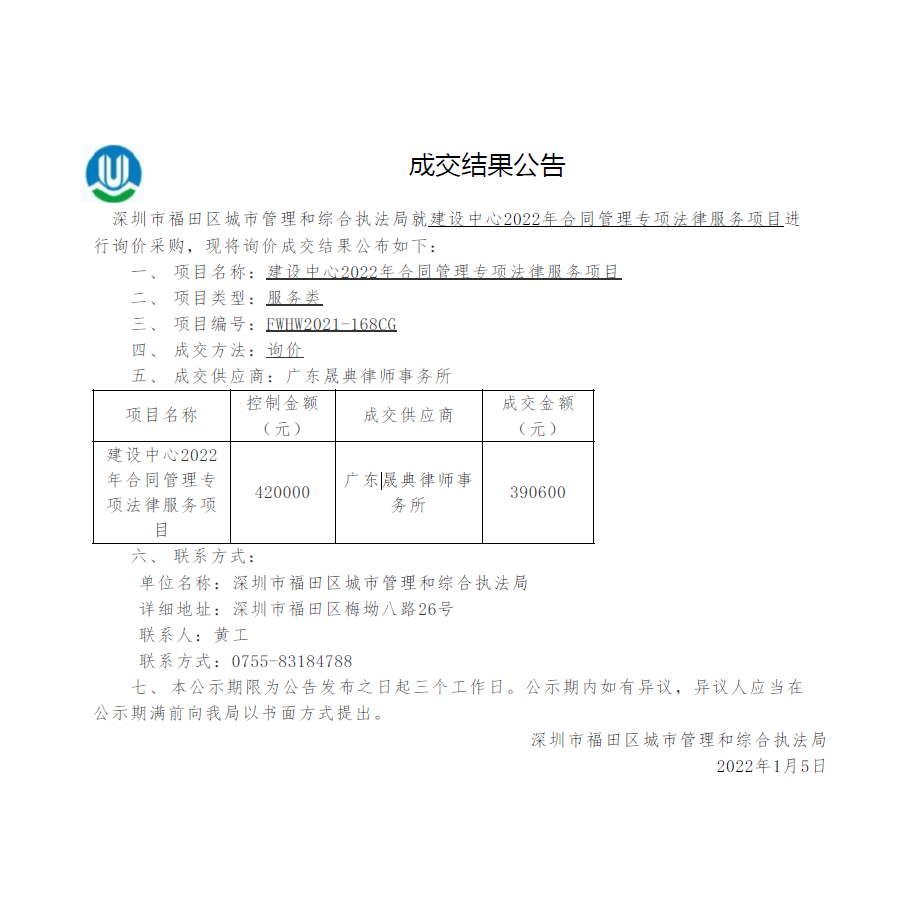 快三平台 城市管理和综合执法局关于建设中心2022年合同管理专项法律服务项目成交结果公告