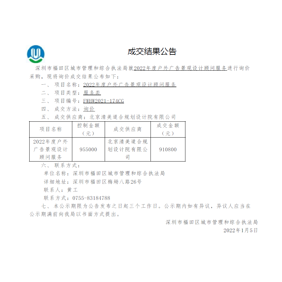 快三平台 城市管理和综合执法局关于2022年度户外广告景观设计顾问服务成交结果公告