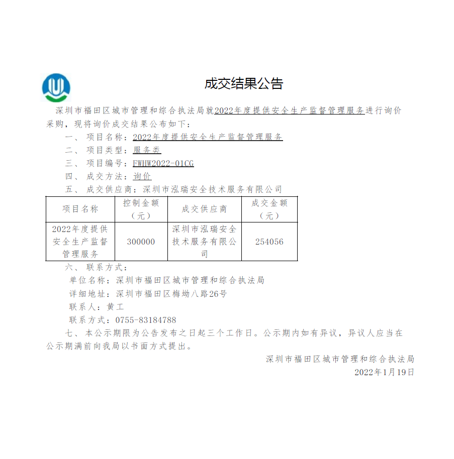 快三平台 城市管理和综合执法局关于2022年度提供安全生产监督管理服务成交结果公告