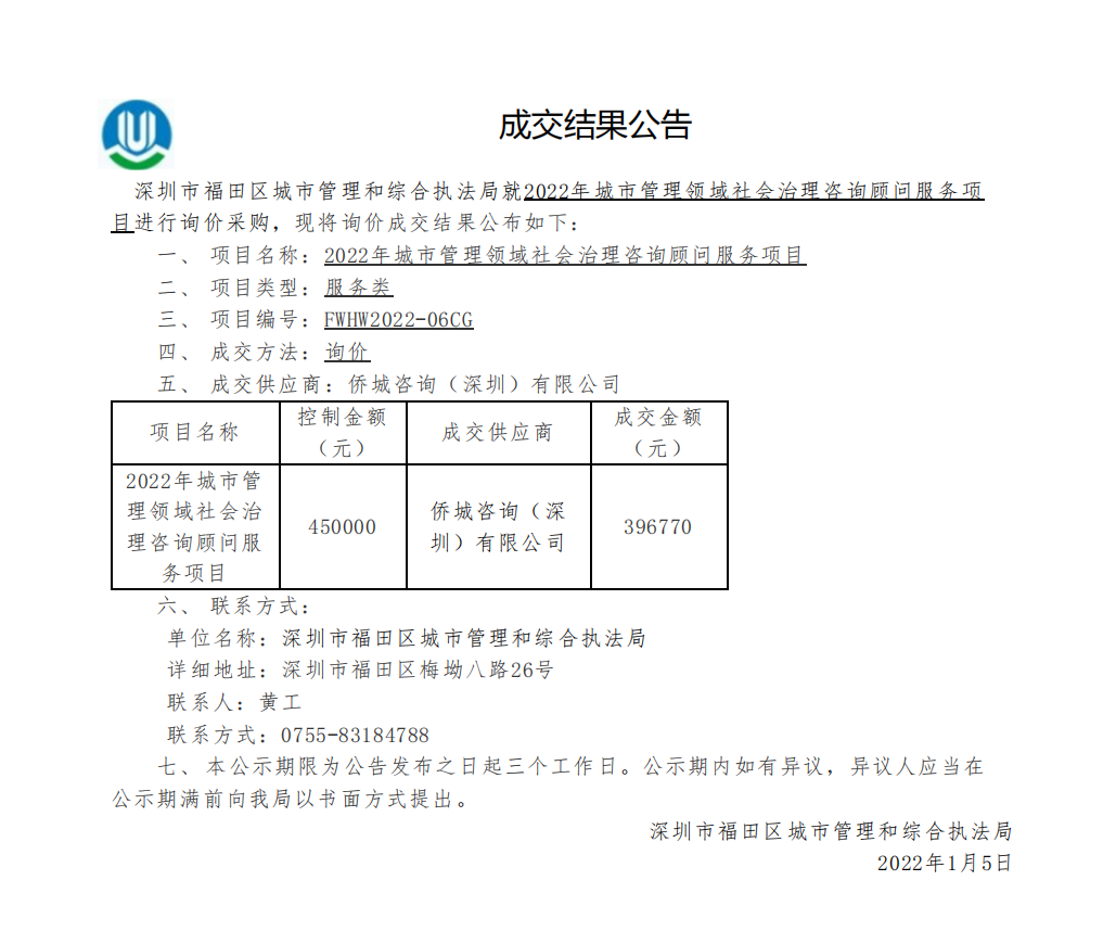 快三平台 城市管理和综合执法局关于2022年城市管理领域社会治理咨询顾问服务项目成交结果公告
