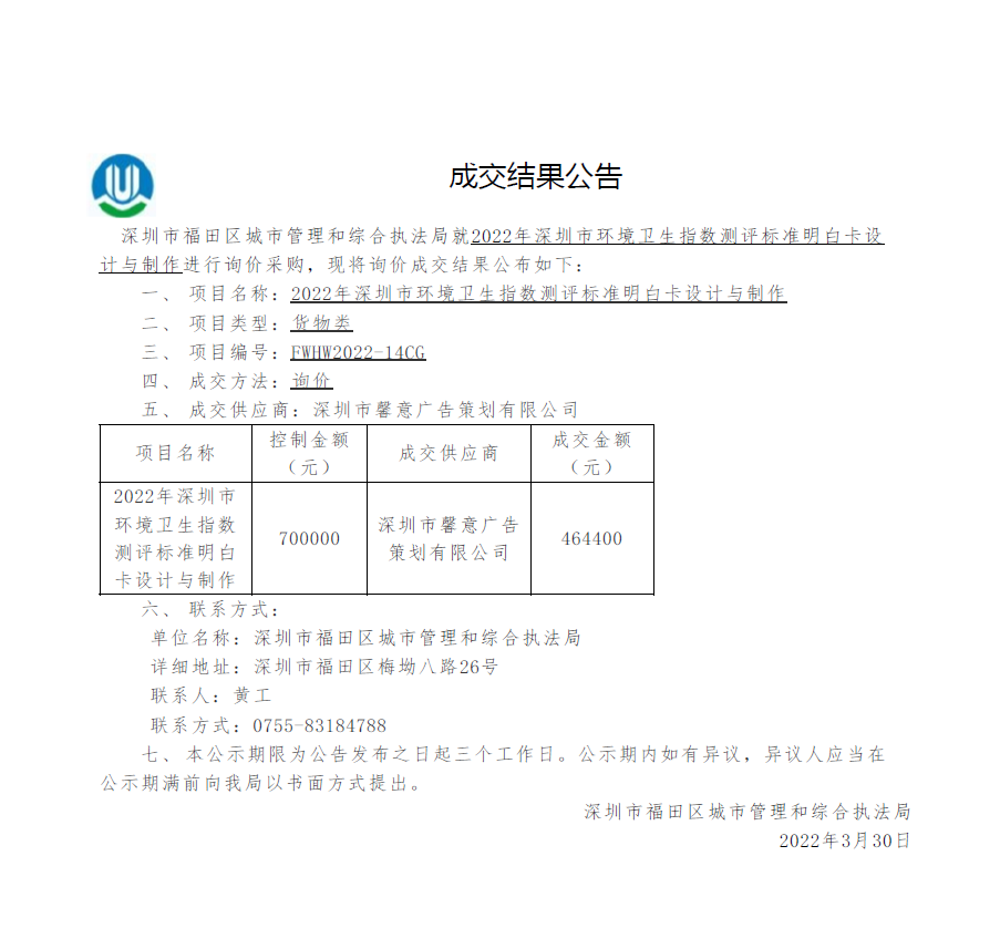 快三平台 城市管理和综合执法局关于2022年深圳市环境卫生指数测评标准明白卡设计与制作成交结果公告