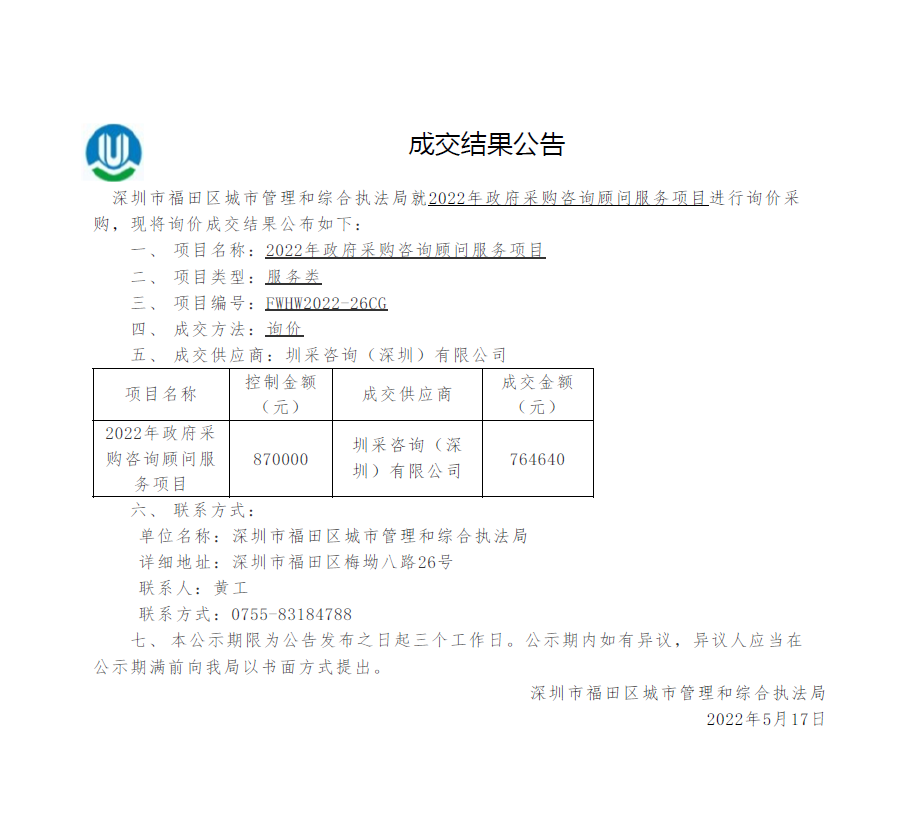 快三平台 城市管理和综合执法局关于2022年政府采购咨询顾问服务项目成交结果公告