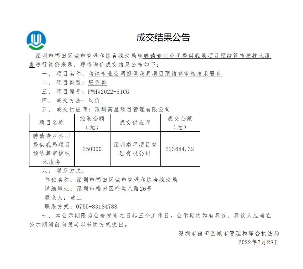 快三平台 城市管理和综合执法局关于聘请专业公司提供我局项目预结算审核技术服务成交结果公告
