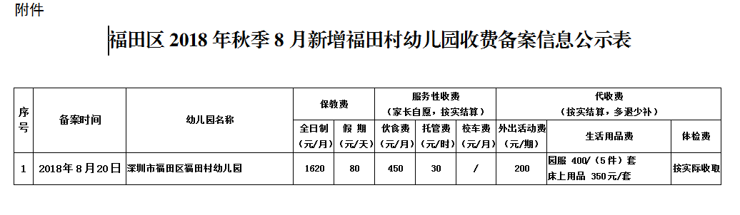 附件:快三平台 2018年秋季8月新增福田村幼儿园收费备案信息公示表