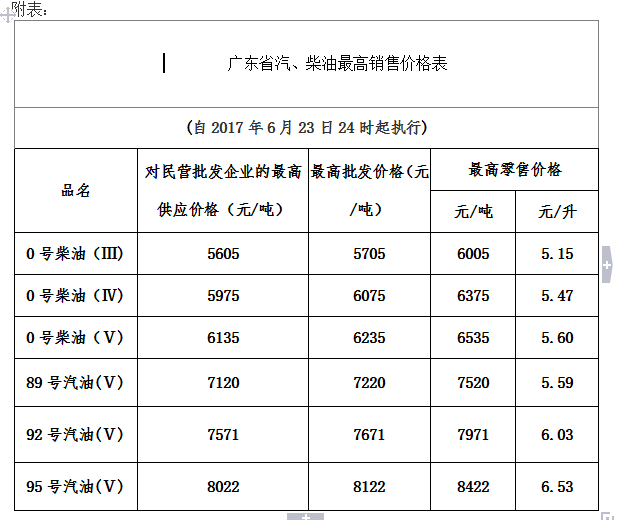 根据国家成品油价格形成机制,结合近一段时期国际市场油价变化情况,国家发展改革委决定自2017年6月23日24时起降低国内成品油价格,即在现行价格的基础上,我省汽、柴油价格每吨分别降低250元和240元,平均每升降低约0.20元。调整后,我省成品油最高销售价格见附表。