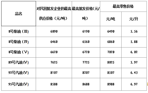 根据国家成品油价格形成机制,结合近一段时期国际市场油价变化情况,国家发展改革委决定自2016年12月14日24时起提高国内成品油价格,即在现行价格的基础上,汽、柴油价格每吨分别提高435元和420元。这次成品油价格调整后,我省国V标准92号汽油从6.08元/升提高到6.43元/升,每升提高0.35元;国V标准95号汽油从6.59元/升提高到6.97元/升,每升提高0.38元;国V标准0号柴油从5.66元/升提高到6.02元/升,每升提高0.36元。