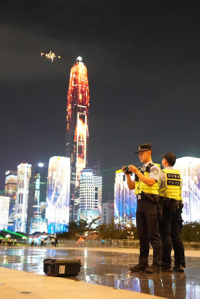 福田中心区的灯光秀表演,深受市民游客喜爱,假期的表演,更是吸引了大量市民游客前往欣赏。为保障安全,警用无人机在空中往返巡逻,遇到求助警情时快速精准定位,人流拥挤时空中喊话快速疏导,这为市民游客带来了更安心舒适的游玩体验。