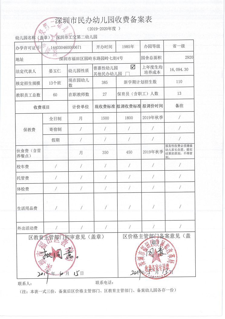 2019年深圳市工交第二幼儿园收费标准