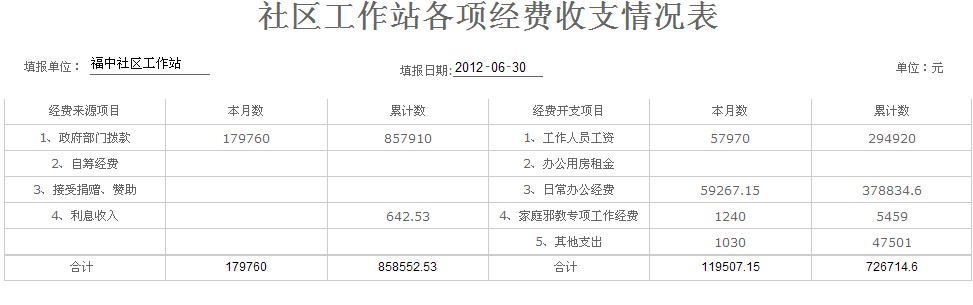 福中社区工作站各项经费收支情况表