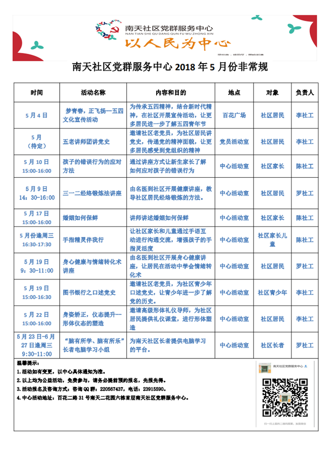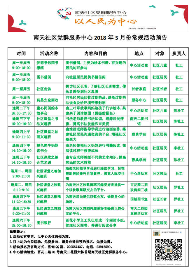 园岭街道南天社区党群服务中心2018年5月活动预告