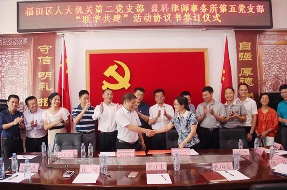 7月11日下午,举行区人大常委会机关第二党支部与北京市盈科(深圳)律师事务所第五党支部“联学共建”活动协议书签订仪式。区人大常委会党组副书记、副主任王跃平,区人大常委会党组成员、副主任陈慧明,区人大常委会机关各支部书记及第二党支部全体党员参加了签约仪式。