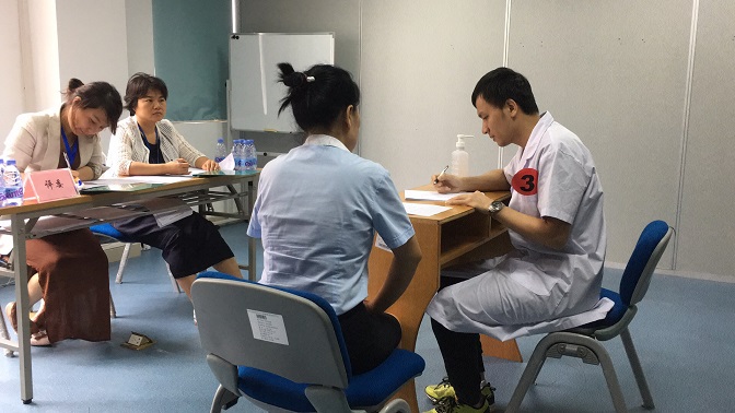 全区共有6家举办医院、3家社会办区域社康中心派出103名选手参加了比赛。竞赛分为全科诊疗组和社区护理组,形式包括综合理论笔试、技能操作考核两个部分。综合理论笔试得分排前20名的参赛选手进入技能操作比赛。全科诊疗技能操作设置四个站点,考核参赛选手对标准化病人的全科诊疗过程、眼底镜和检耳镜的操作和结果判读等内容。社区护理技能操作设置三个站点,采用案例分析的形式,考核社区护士的基本技能、急救技能、基本操作等。