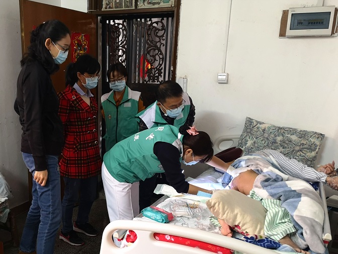 社管中心基本医疗管理科工作人员,随同中大八院家庭病床巡查服务队医护人员,一起来到了福南社区叶秀芳老人家中,现场跟进中大八院家庭病床巡查服务队的工作流程,获取详实的工作资料。