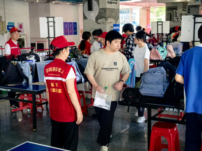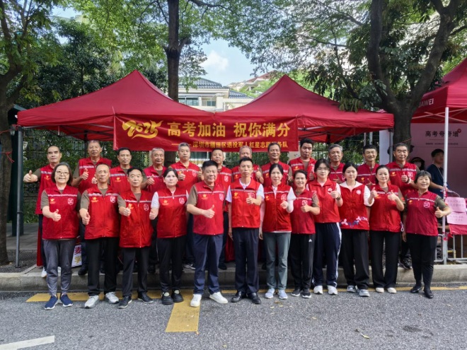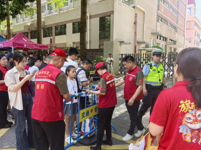 退役军人红星志愿服务队的144名队员到岗就位,以军人特有的纪律性与使命感,为福田考生筑起一道温暖的“护考长城”。