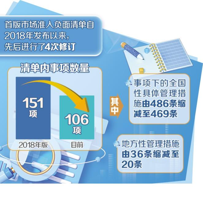 首版市场准入负面清单自2018年发布以来,先后进行了4次修订。目前,清单内事项数量已由2018年版的151项压减至106项,压减比例约30%。其中,事项下的全国性具体管理措施由486条缩减至469条,地方性管理措施由36条缩减至20条。