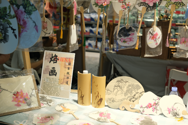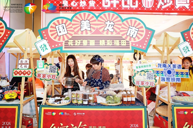 记者看到,现场商品琳琅满目,不仅有小吃糕点、月饼手作、3D打印模型等产品,更有非遗漆扇、客家米酒“杨村古酿”、国家级非遗南阳烙画等非遗产品供市民亲身体验和挑选。现场气氛热烈,吸引了众多市民前来打卡并合影留念。