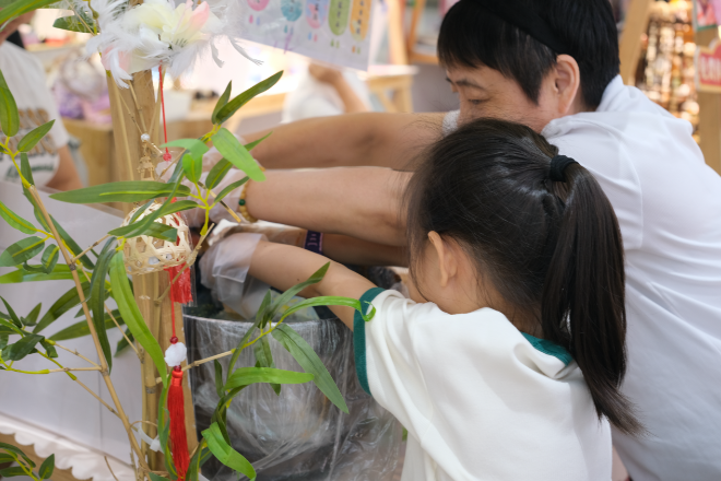 在活动现场,非遗漆扇摊位十分火爆,吸引了许多家长和孩子近距离体验手工制作漆扇的工艺。简单地往水里滴上不同颜色的油漆,再轻轻吹气让颜色在水面散开,将扇子浸入水中小心地转动后提起,经过宣纸吸收多余的水分,便得到了一把独一无二充满古韵色彩的漆扇。据了解,漆扇的历史可追溯到东汉时期,漆器在当时已经成为一种重要的工艺品。而漆扇作为结合了漆器工艺和扇子形态的艺术品,以漆为笔,以扇作画,简单的几滴油漆便能创作出充满变化的主题和图案,展现了古人的浪漫与智慧。