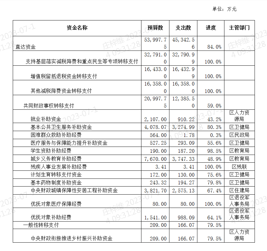 截至2023年6月30日,我区共收到中央财政直达资金5.40亿元,已全部下达至各执行单位或主管部门。支出4.53亿元,支出进度84.0%。具体如下: