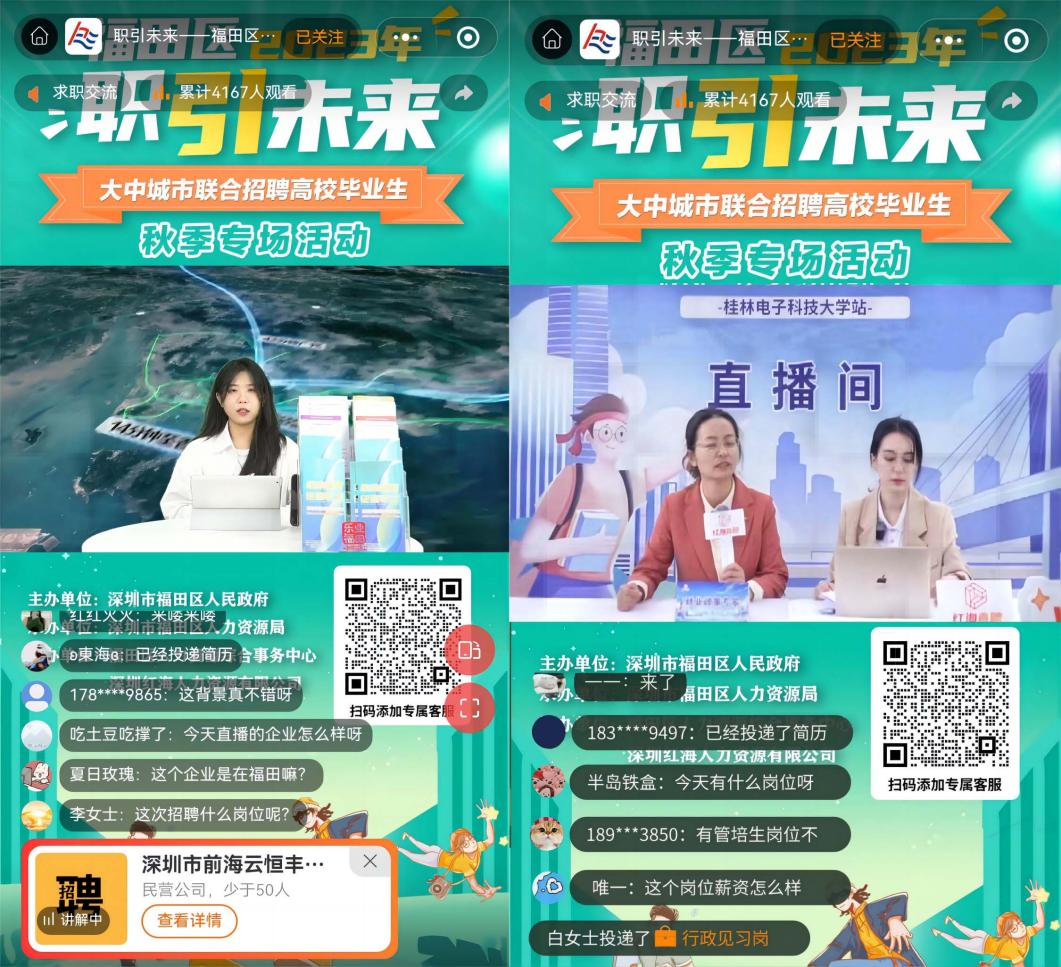 本次直播带岗活动采取主会场+高校分会场联播的形式,联动桂林电子科技大学,开设福田会场及桂林电子科技大学分会场。活动邀请了金地集团、顺丰速运等30家企业参加,提供1000多个就业岗位,涵盖教育、科技、新媒体等多领域,为毕业生提供多样化、优质化的就业选择。