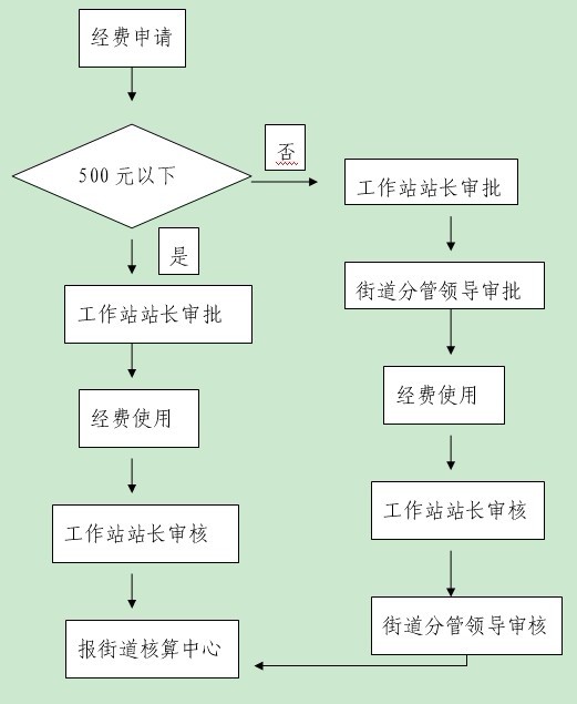 500元以下的经费使用可由工作站站长审核批准,现金支付,向街道核算中心报账;